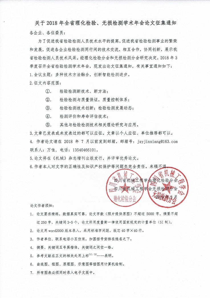 關(guān)于2018年全省理化檢驗(yàn)、無(wú)損檢測(cè)學(xué)術(shù)年會(huì)論文征集通知